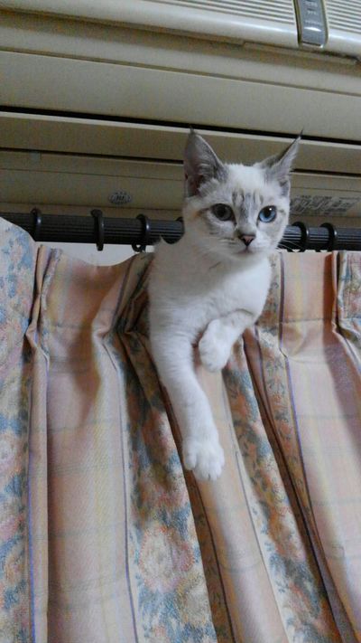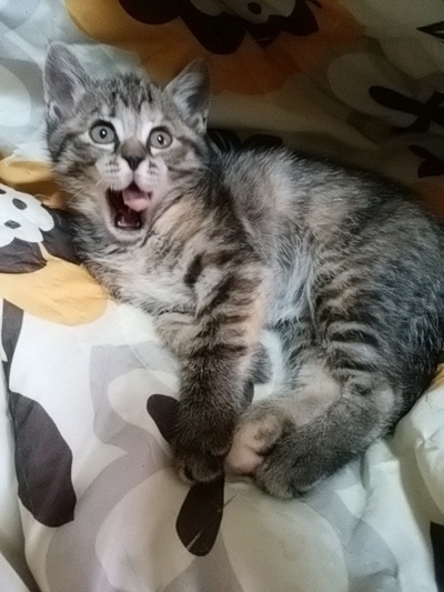 生後一月半の「すみれ」です。とても元気で部屋中を走り回っています。3月26日掲載の「杏奈」ちゃんと同じく、カーテン登りをしてレールで立ち往生。(自分で降りられない!)先住猫2匹に飛びかかっては猫パンチを食らう今日この頃です。