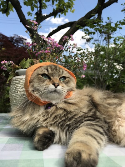 先日八ヶ月を迎えた小町、日々もふもふ感が増していきます。初夏の日差しを浴びて、お気に入りのみかんの帽子を被り気持ち良さそうです。